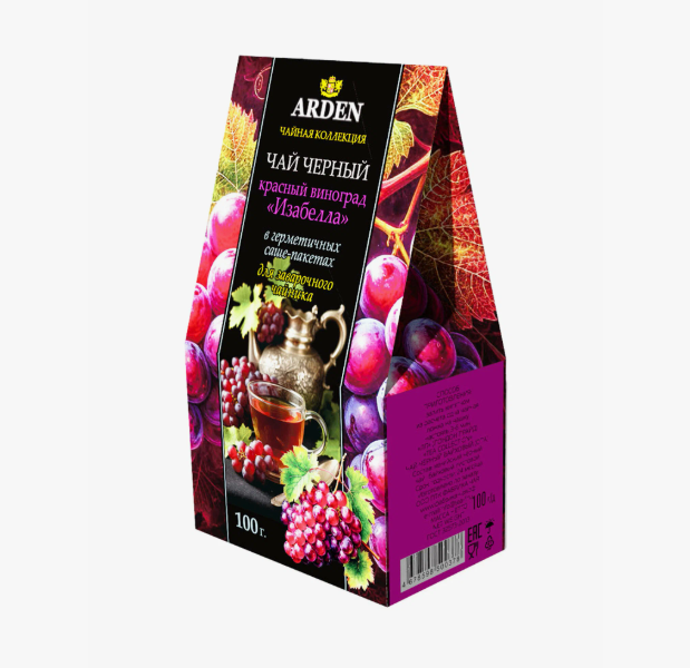 крепкий и душистый черный чай с ярким ароматом красного винограда Изабелла. Он выпускается в индивидуальных саше-пакетах.