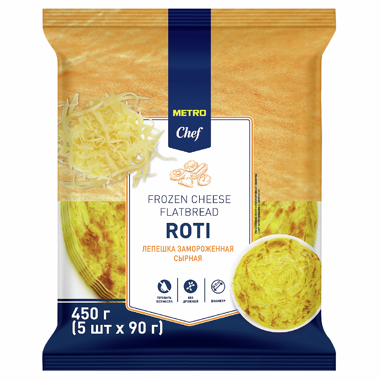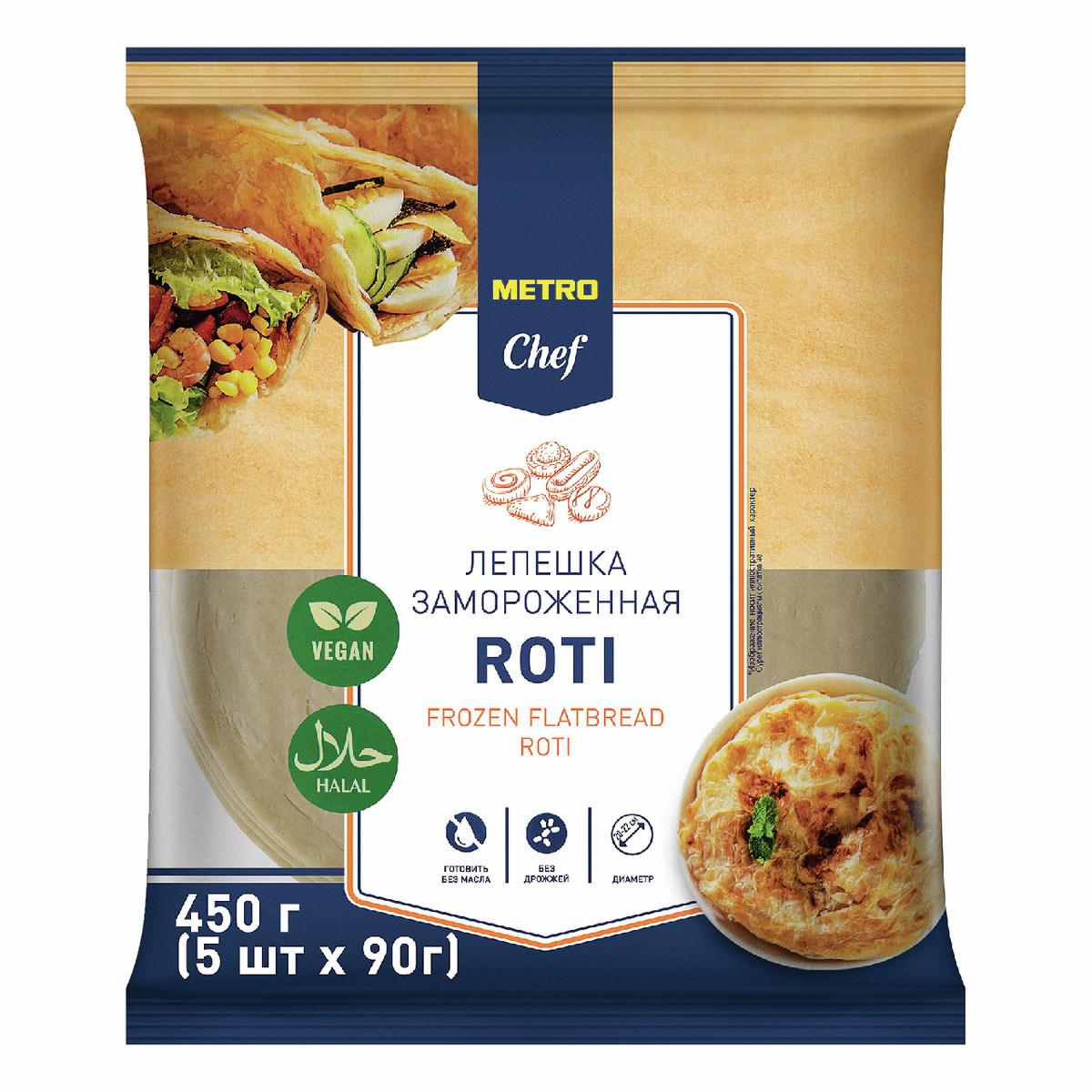 Лепешка роти слоеная замороженная, 5шт x 90г сделана из пшеничной муки, воды, соли и сахара без добавления дрожжей. Перед употреблением ее не надо размораживать. Достаточно обжарить полуфабрикат на горячей сковороде без добавления масла по 1 минуте с каждой стороны.