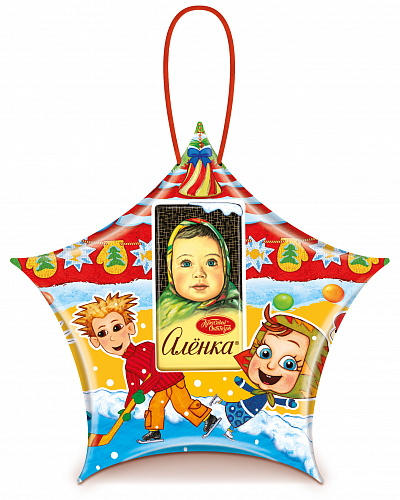 Набор упакован в яркую картонную коробку в форме звезды. Небольшой сладкий подарок со сладостями бренда Аленка на новогодние праздники.