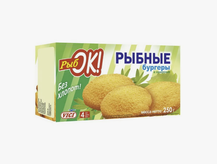 Аппетитные рыбные бургеры «РыбОк» от бренда Vici. Продукт представляет собой сформированные котлеты из высококачественного рыбного фарша, полностью готовые к приготовлению. Быстро обжариваются на сковороде или гриле.