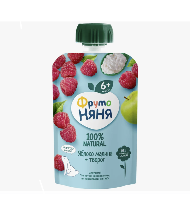 Фруктовое пюре «ФрутоНяня» из яблок и малины с творогом разработано специально для того, чтобы разнообразить рацион вашего малыша. В нём польза натурального творога, необходимого для гармоничного роста и развития малыша, сочетается со вкусом отборных спелых ягод и фруктов.