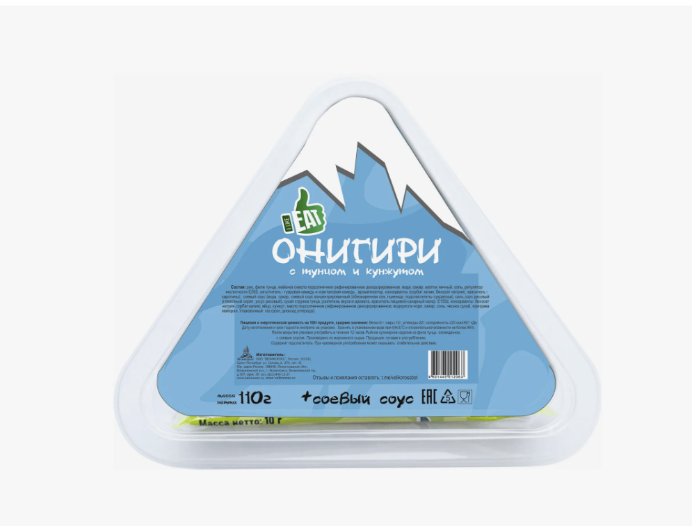 Онигири, или японский сэндвич. В нём — рис, водоросли нори и начинка из тунца с кунжутом. Блюдо дополняет соевый соус и лоток для него.
